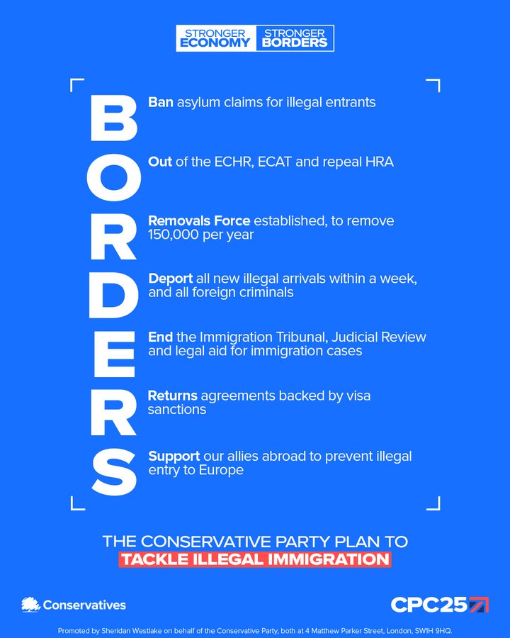 Voraussetzung des Borders Plan ist, so Philp auf dem Parteitag, der Austritt Großbritanniens aus der Europäischen Menschenrechtskonvention: „Enabled by ECHR exit, we will ban all asylum and other claims by illegal immigrants. And this will mean all those arriving illegally – including by small boat – will be immediately deported back to their country of origin if possible or to a third country like Rwanda if not within a week of arrival.“ Illustriert mit drastischen Einzelfällen kriminell gewordener Migranten und unter Verweis auf die USA kündigte er die Abschaffung des Rechtswegs für Betroffene und die Schaffung einer dem Innenministerium unterstehenden Behörde namens Removals Force mit enormem Budget an: „And by stripping away the legal obstacles […] we can remove 150,000 people a year that no legal right to be here. That is three-quarters of a million over the course of the next Parliament. This illegal immigration scandal will end.“ Philp bezog sich explizit auf Forderungen der Farage-Partei Reform UK nach Deportationen im Millionenmaßstab und präsentierte den eigenen Plan gleichsam als dessen realpolitische Variante. „Our plan is radical, yes, not because we are ideologues but because this plan has to be radical in order to work. The old ways have been tried, and they have failed. That’s why a new approach is needed.“