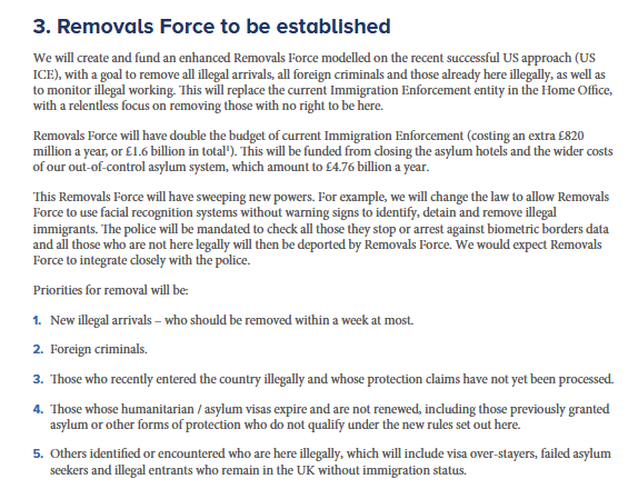 Im Mittelpunkt des Plans stehen die Bootspassagen auf der Kanalroute, deren Anstieg im laufenden Jahr als Beleg für die Unwirksamkeit der bisherigen Grenzpolitik und das vermeintliche Versagen Keir Starmers gedeutet wird. Illustriert wird der Plan durch ein Foto Philps bei seinem oben erwähnten Auftritt bei Loon-Plage und Gravelines. Explizit benennt das Dokument die US-amerikanische ICE als Vorbild: „We will create and fund an enhanced Removals Force modelled on the recent successful US-approach (US-ICE)“. Die Ausführungen über Sonderbefugnisse der geforderten Removals Force lassen an die brutalen und rechtsfreien Praxis der ICE-Häscher_innen denken: „For example, we will […] allow Removals Force to use facial recognition systems without warning signs to identify, detain and remove illegal immigrants. The police will be mandated to check all those they stop or arrest against biometric borders data and all those who are not here legally will then be deported from Removal Force.“